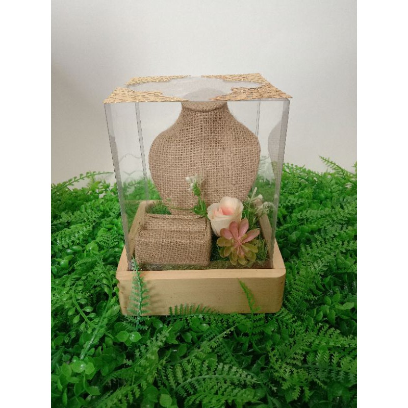 untuk tempat perhiasan kalung dan cincinukuran 14x14cm tinggi 17cmwarna goni tatakan bahan kayu silahkan di pesan sist produk ready siap kir