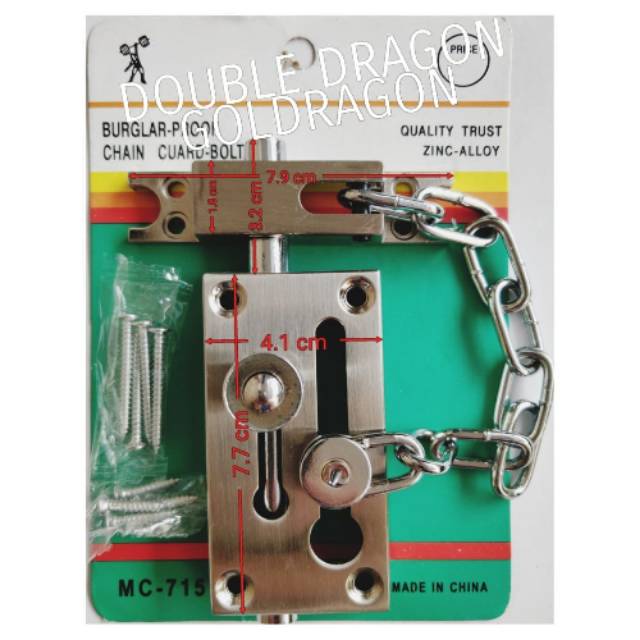 Grendel Rantai - Merk : Ferza- Material : Iron (Besi)- Warna : Satin Nickel (SN)- Model No. : MC-715Dimensi :- Grendel : 7,7 cm x 4,1 cm - Plat Lawan : 7,9 cm x 1,8 cm - Panjang Rantai : 17 cmHarga per