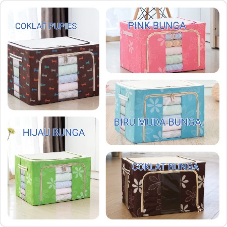 Pusing dengan pakaian yang terlalu banyak sehingga lemari pakaian sudah tidak mampu menampungnya. Atau pusing dengan mainan si kecil yang berserakan dimana-mana??Gak perlu pusing, ada STORAGE BOX 66 liters frame baja Double Zipper Large Box 66LDouble zipper large box adalah kotak serbaguna dengan kapasitas 66 Liter, fungsinya untuk tempat menyimpan pakaian atau mainan anak-anak, agar bebas dari debu dan lebih rapiUniknya, box ini terdapat 2 pintu, bisa buka dari atas dan samping. Pintu atas cocok untuk mengisi pakaian atau mainan ke dalam box. Pintu depan cocok untuk mengambil pakaian keluar dari box. Sangat Praktis bukan ??Box dilengkapi 3 pcs rangka dari bahan stainless di bagian dalam box. Dengan rangka stainless ini box bisa berdiri dengan kokoh, gak bakal lemas.Pada bagian alas box terjahit lapisan papan tipis, kuat untuk menampung pakaian dan mainan. Terdapat pegangan di samping kiri kanan boxSatu box bisa menampung 40-50 pcs pakaian. Box bisa dilipat saat sedang tidak dipakaiSangat cocok bagi anda yang sering pindah tempat tinggal. Dengan box ini, anda tidak perlu lagi beli lemari pakaian, irit uang.- Material : Oxford tebal- Size : 50 x 40 x 33 cmReady Warna- BUNGA HIJAU- BUNGA BIRU MUDA- BUNGA PINK- BUNGA COKLAT- COKLAT PUPPIES- CREAM PUPPIES**GAMBAR YANG DI TAMPILKAN SESUAI PRODUK YANG DIJUAL**=====================================================Catatan:*Apa yang anda lihat pada gambar, itulah yang anda peroleh*Jika terdapat sedikit perbedaan pada warna hal ini disebabkan pengaturan yang berbeda pada layar monitor*Harap cantumkan warna yg di ingini pada order atau kami kirim random*Untuk Dropshiper harap cantumkan nama & hp pengirim pada kolom DropshipBarang Sudah Dicek kondisi Fisik Bagus (Tidak Pecah, Rusak, Patah, Dll). Kerusakan Yg Terjadi Dalam Perjalanan (xpdc) Bukan Tanggung Jawab Pe