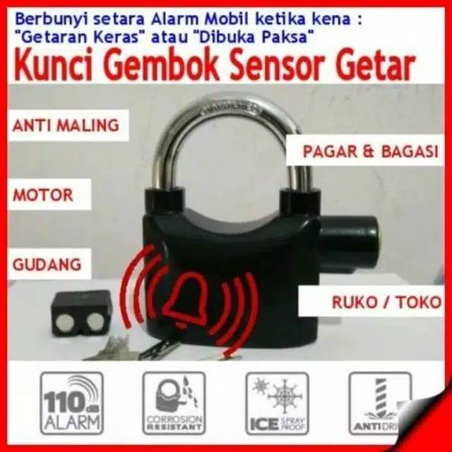 MERK kinbar !!!!!!! GOOD QUALITY !!!!!! Bagian Tengah ada LengkunganGembok Alarm bisa utk motor dan pagar rumahRing panjang tinggi keseluruhan 13cm tinggi ring 6,5cm merek kinbarRing pendek tinggi keseluruhan 8cm tinggi ring 4,5cm merek alarm lockWarna Tersedia : HitamGembok Alarm anti karat yang dapat mengeluarkan suara / bunyi alarm 110 dba (setara suara alarm mobil), sehingga dapat membuat pencuri / maling panik karena menimbulkan perhatian orang lain.Tinggi x Lebar x Tebal13cm x 7cm x 3cmDeskripsi :Gembok ini dapat mengeluarkan suara alarm jika diaktifkan, dapat juga berfungsi sebagai gembok biasa jika di-nonaktifkan alarm nya. Digunakan untuk mengunci cakram motor, rumah, toko dan lain-lain.Kelengkapan :- 1 buah gembok + baterai terpasang- 1 ring- 3 buah kunci (tidak dapat di duplikat)- 6 buah baterai cadangan"silakan coba gembok alarm"Cara penggunaan:1. Buka tangkai gembok dengan masukan anak kunci k lubang kunci yg ada disamping badangembok2. Pasang tangkai gembok dengan posisi diputar maka akan berbunyi tet.. yg menandakanalarm telah berfungsi3. Getaran/guncangan dibadan gembok pertama akan bunyi tet-tet-tet..getaranselanjutnya akan berbunyi seperti