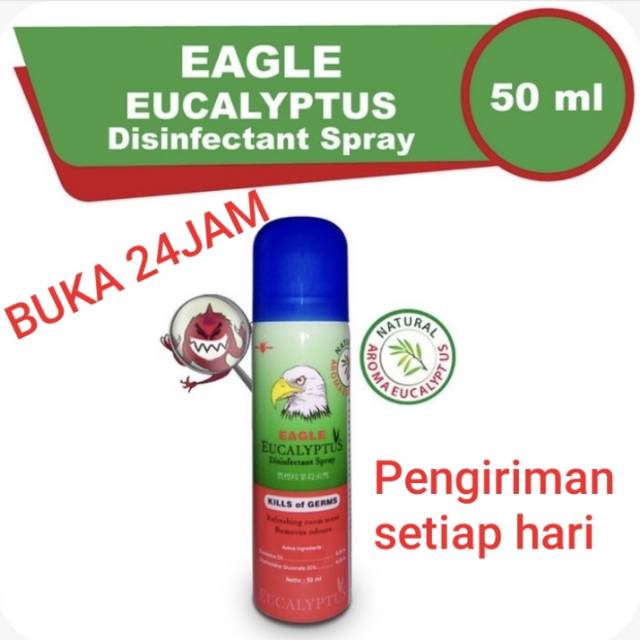 PACKING BUBBLE WRAPDeskripsi Eagle Eucalyptus Disinfectant SprayEagle eucalyptus disinfectant sprayKemasan terbaruIsi bersih 50 mlExpired 2025Ready stock silahkan langsung diorder :)Eagle eucalyptus sprayCairan semprot multiguna dapat membunuh kuman-kuman yang berada di udaraGunakan eucalyptus spray pada :• daerah kamar mandi• dapur• tempat penyimpanan / ruangan• gagang telepon• tempat pembuangan sampah• tempat bermain anak• ruang tamu• kamar tidur• di dalam mobil• k