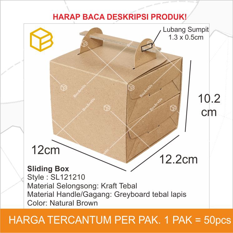 CATALOG INI HANYA SELONGSONG NYA SAJA.Selongsong bisa dibeli DENGAN/TANPA handle (gagang).BOX CB121205 DIJUAL TERPISAH. SUMPIT TIDAK DIJUAL.Kemasan ini didesain dengan unik seperti rantang. Cocok utk menampung 2pcs boxkode CB121205.Contoh Aplikasi:- 1 box diisi nasi goreng, 1 box diisi sayur mayur. Ditumpuk seperti foto,kaitkan sumpit anda, dan kemasan makanan-mu akan jadi pengalaman unik bagicustomer)- 1 box diisi pie, 1 box diisi topping/crumble, tumpuk menjadi sepaketdessert,dan kaitkan handle/gagang. Bisa gunakan pita juga agar lebih elegan).Style : SL121210Material Selongsong: Kraft TebalMaterial Handle/Gagang: Greyboard tebal lapisColor: Natural BrownSize : 12.2 x 12 x 10.2cmSize Lubang Sumpit: 1.3 x 0.5cmPrice Selongsong : Rp.1,150/pcPrice Handle: Rp.100/pcPrice Selongsong+Handle: RP.1,250/pcQty/pack : 50 pcsLINK BOX CB121205:https://shopee.co.id/product/12857993/3755510034/Note:-Bahan ini berwarna Natural Brown, terbuat dari bahan daur ulang. Warna dapatsedikit berubah2 tergantung batch kertas daur ulang dan pencahayaan foto.-Size lubang sumpit 1.3 x 0.5cm. Bisa dimasukkan handle (gagang), pita, atausumpit. Pastikan sumpit pilihan sudah cocok dan muat ukurannya dengan lubang.Warna tampilan di layar anda mungkin berbeda dengan warna asli dari produk nya, dikarenakan resolusi tiap layar berbeda -